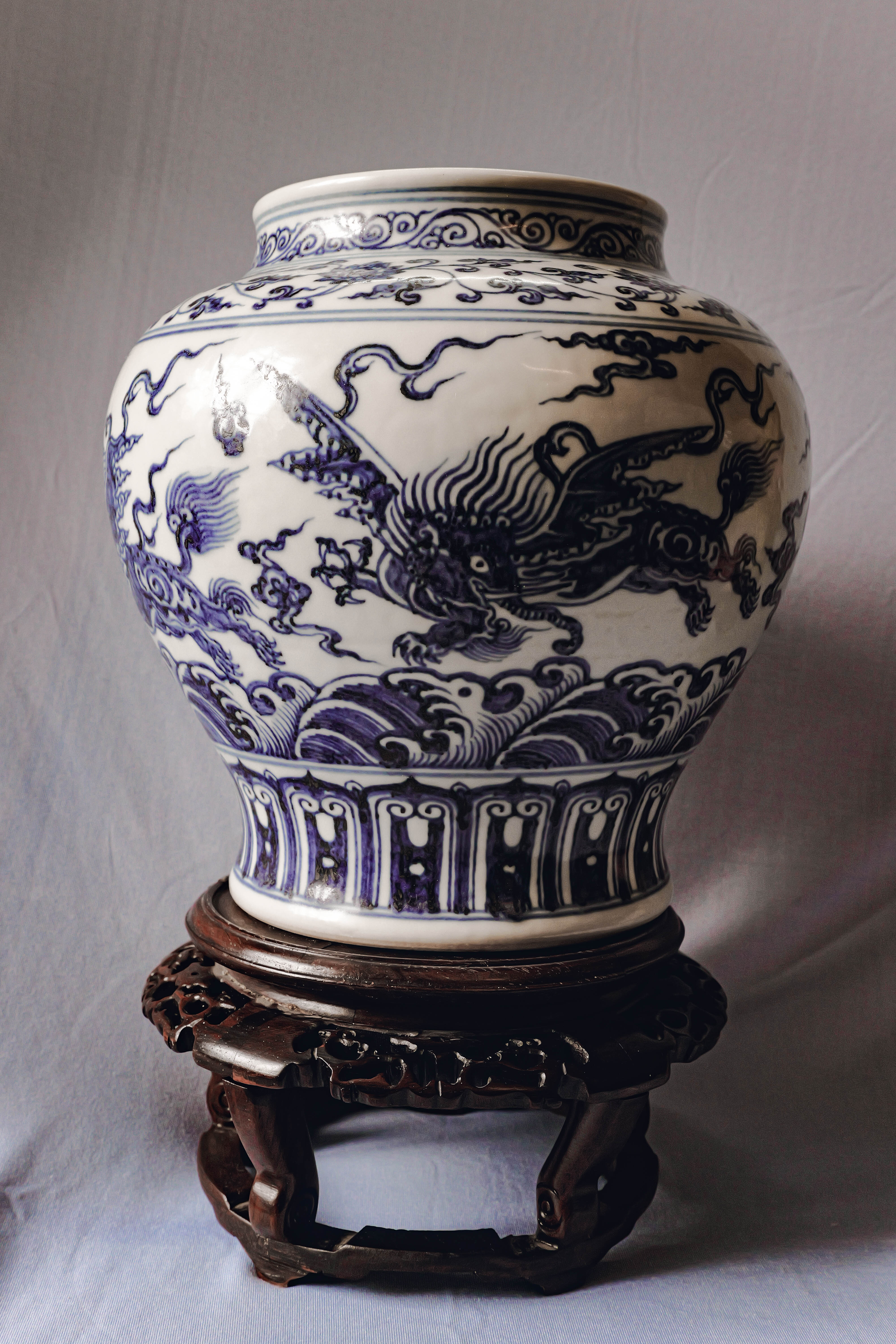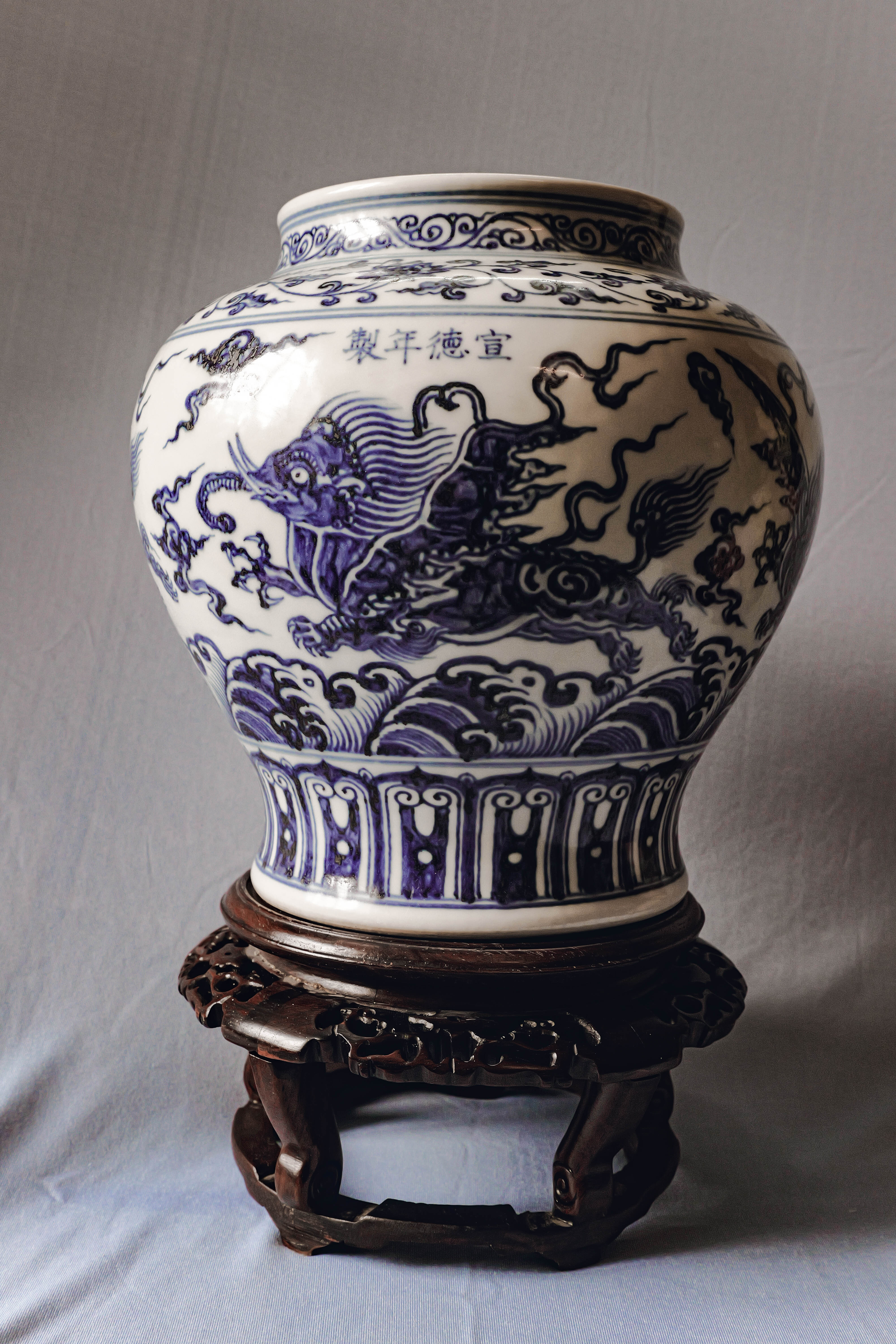 青花海水飞象缠枝花卉纹罐