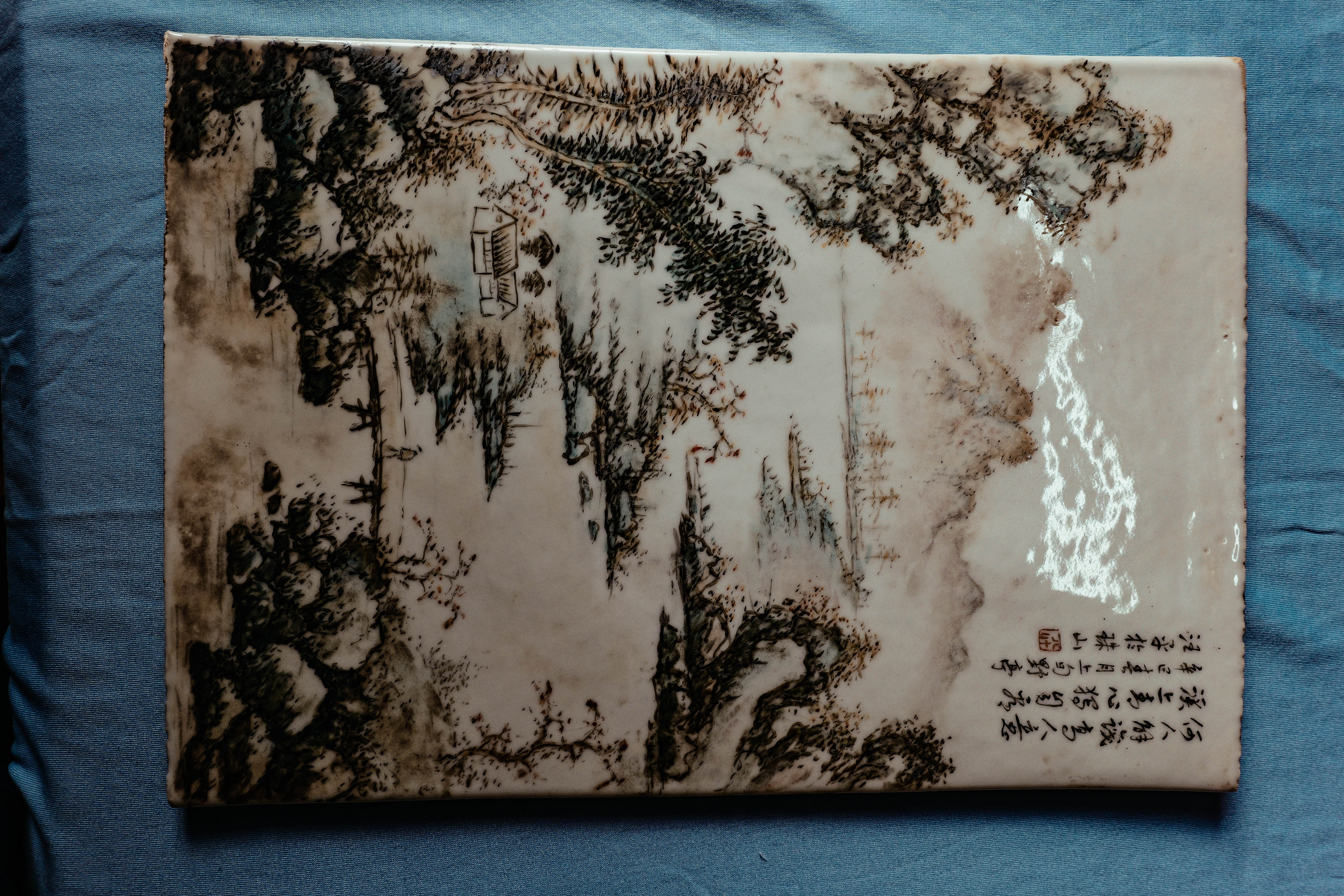 浅绛彩汪野亭款山水人物纹瓷板画 (珠山八友)