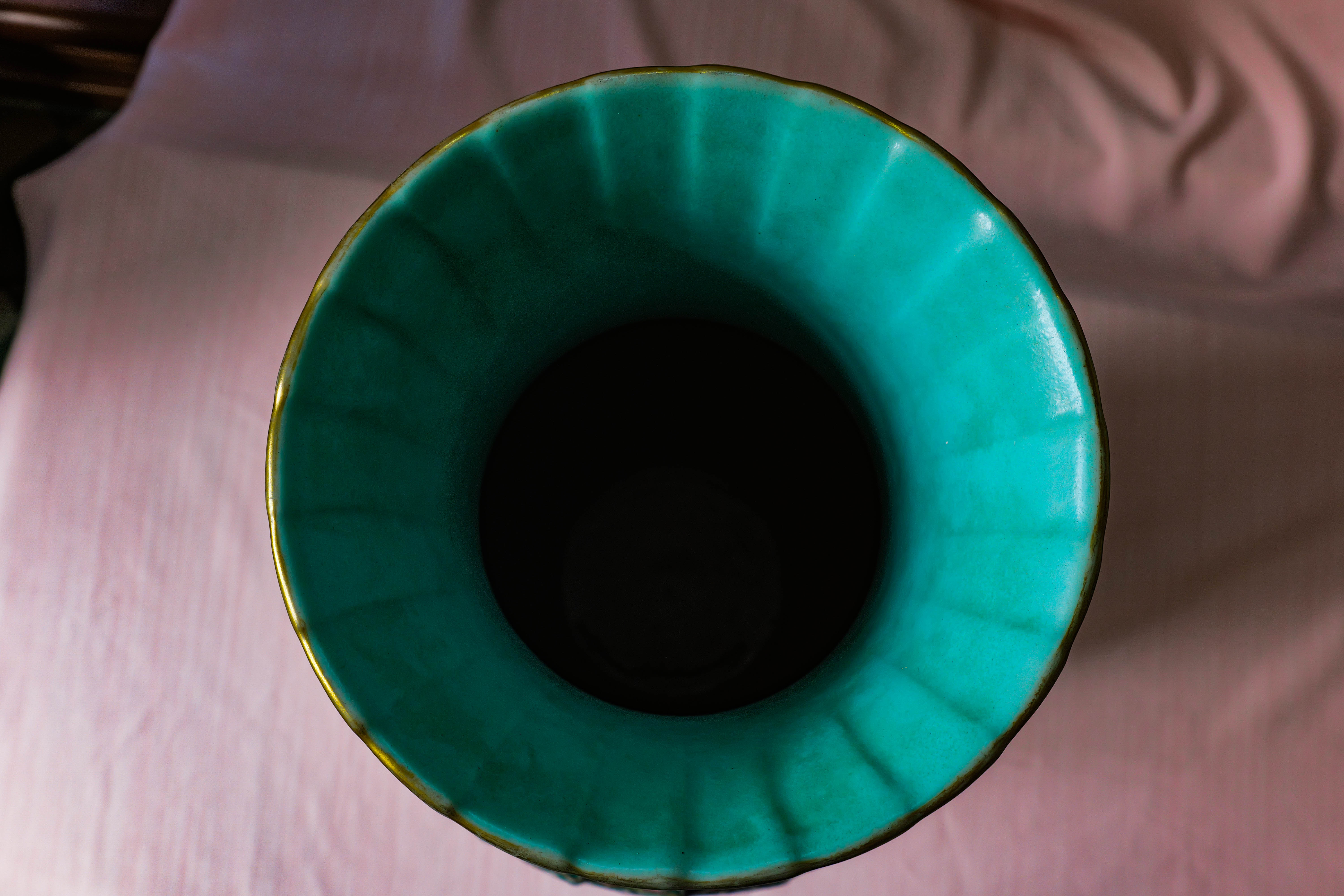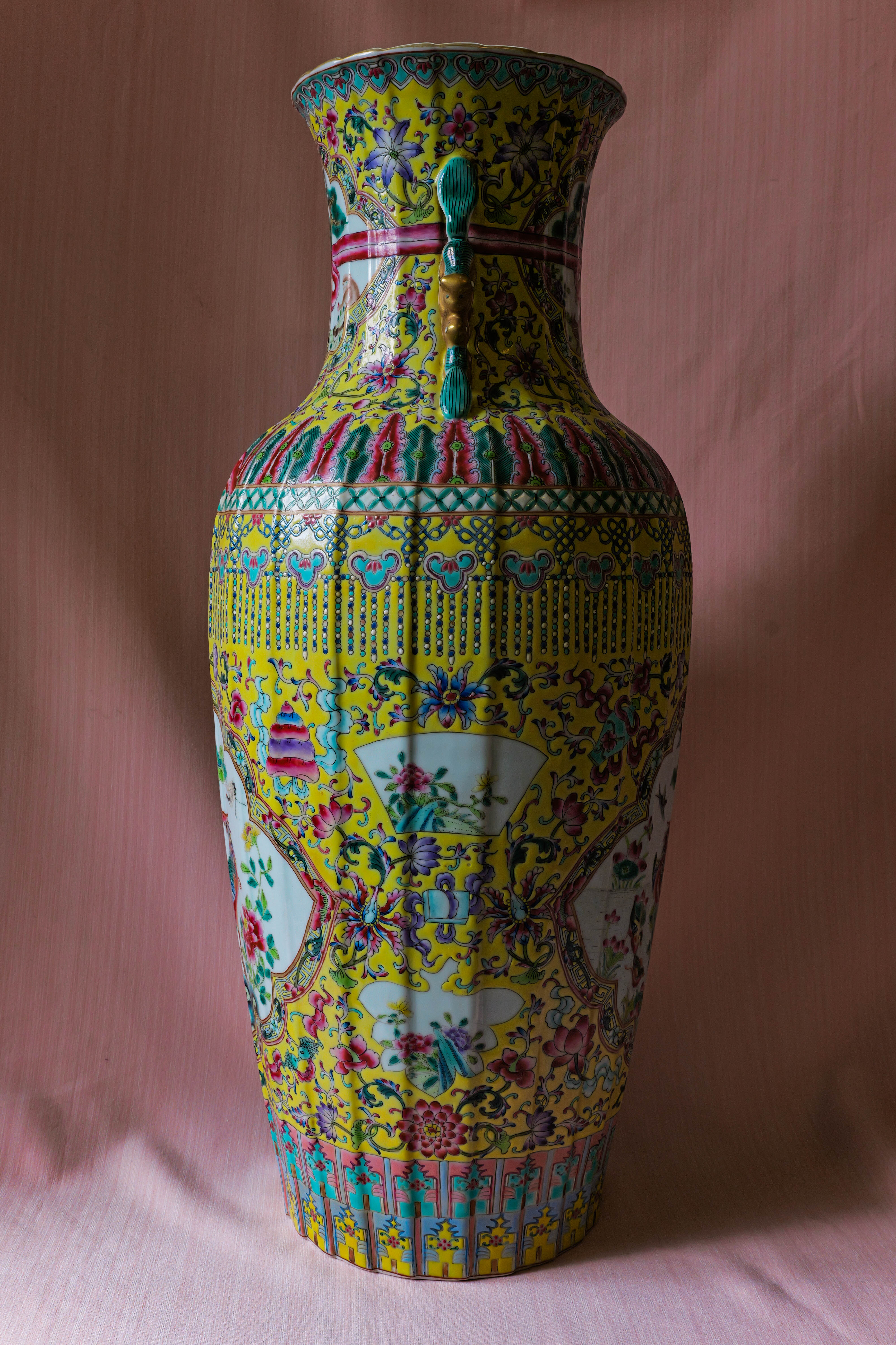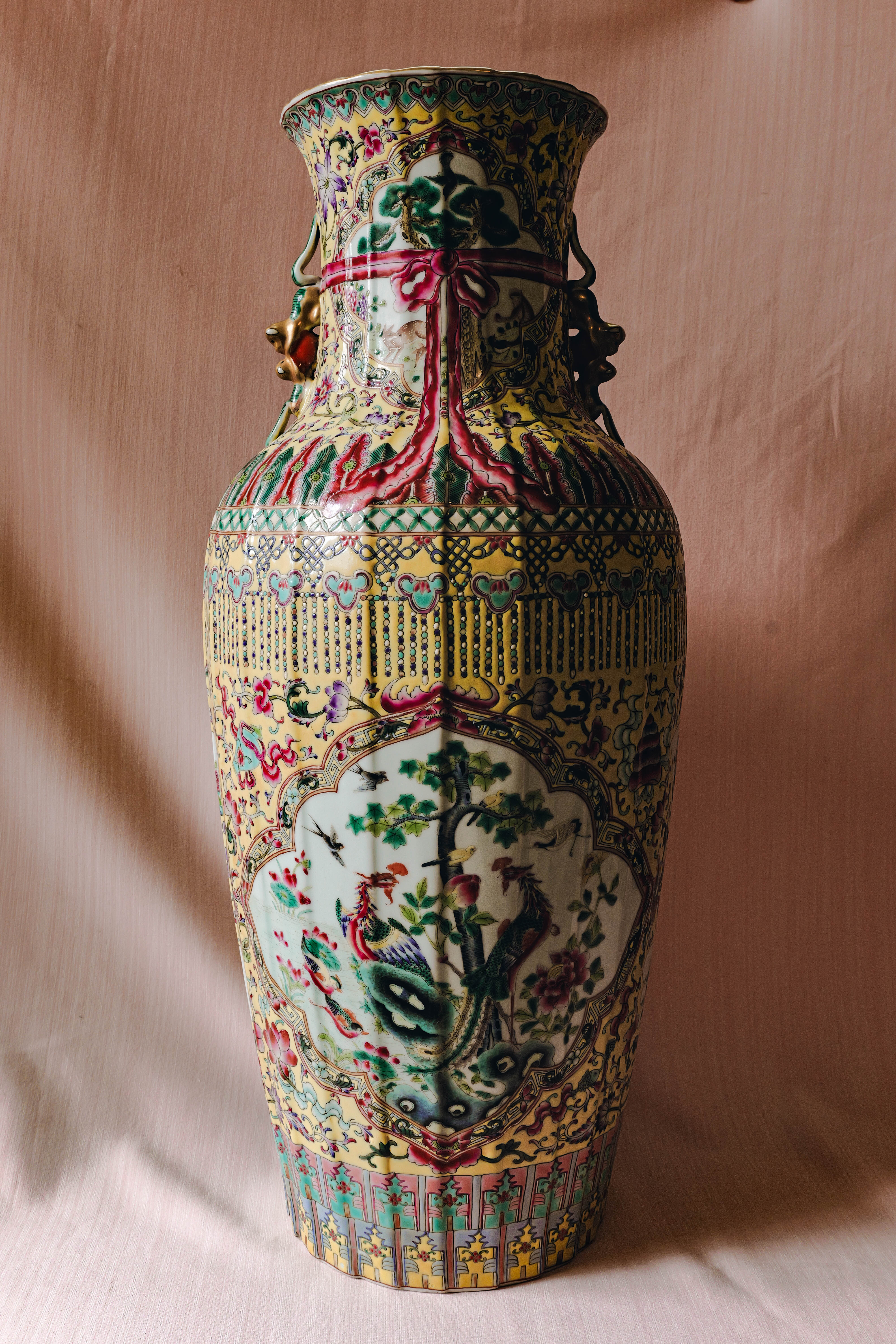 黄地粉彩描金开窗花鸟纹双狮耳大瓶